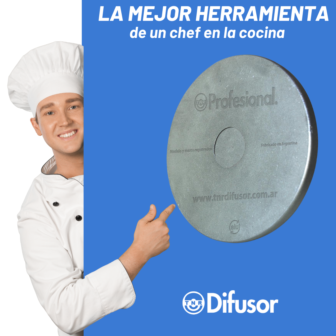 Posee un Diámetro de 40cm, creado para cocinas industriales y gastronómicas. Tiene un peso de 4,5kg y una altura de 3cm.Posee Rompellamas Central, para hornallas en forma de estrella